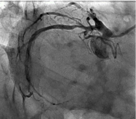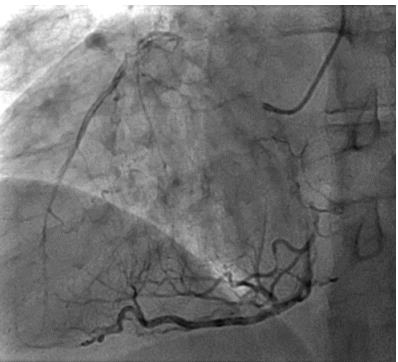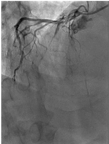 Figure 3 RAO caudal view showing disease in the proximal and distal LCX as well in the proximal OM