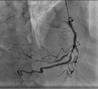 The patient then underwent elective coronary angiography which showed a Normal Left Main, 100% occluded Left Anterior Descending Artery, filling from right sided collaterals, a proximal 80% in the left circumflex with a 99% occluded OM1. The RCA had a proximal 80% lesion with a diffusely diseased acute marginal branch.