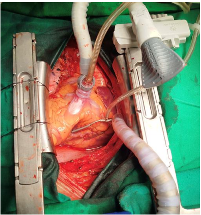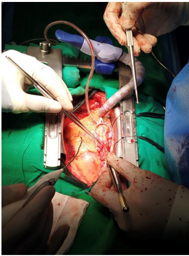 Figure 7: SVG is being anastomosed with PDA and the surgeon is standing on the right side.