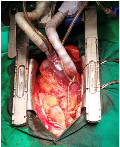 Induction was done as per the standard protocol for CABG patients. After median sternotomy, right internal mammary artery (RIMA) was harvested. RIMA was anastomosed to morphological LAD and saphenous venous graft was anastomosed to the Obtuse Marginal branch and the posterior descending artery to achieve complete Revascularization. The operating surgeon was on the left side of the patient while operating. After surgery, the patient was shifted to postoperative intensive care unit, extubated after 4 h of mechanical ventilation.