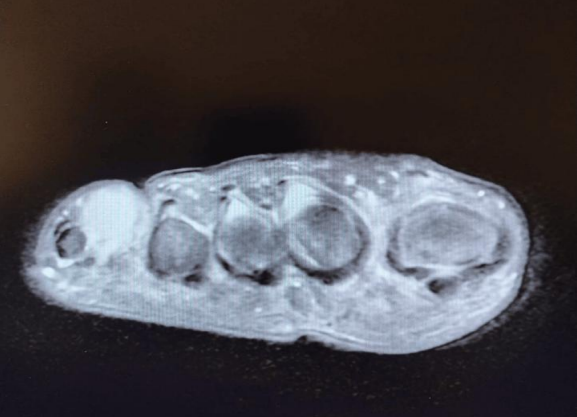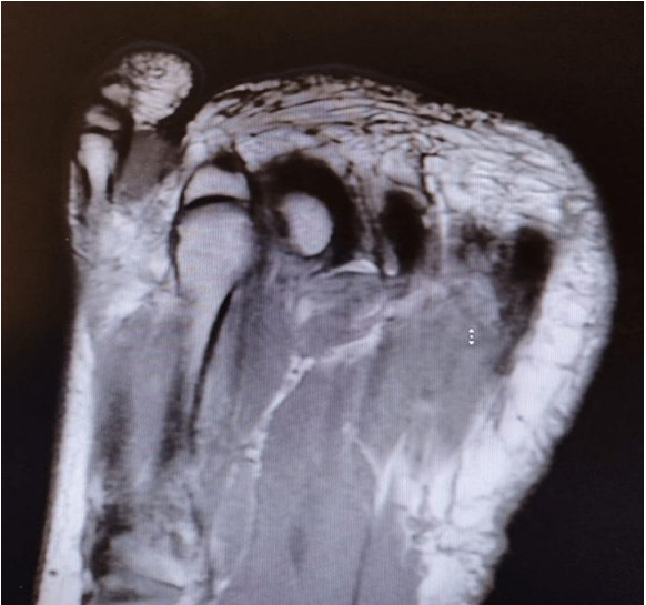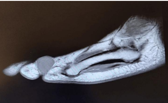 MRI: Revealed an oval-shaped mass on the medial and dorsal aspect of the fifth toe's proximal phalanx, measuring approximately 2 cm. It exhibited intermediate low signal intensity on T1-weighted images and mildly higher heterogeneous intermediate signal intensity on T2-weighted images, closely associated with the flexor tendon (Figures 1, 2 & 3)