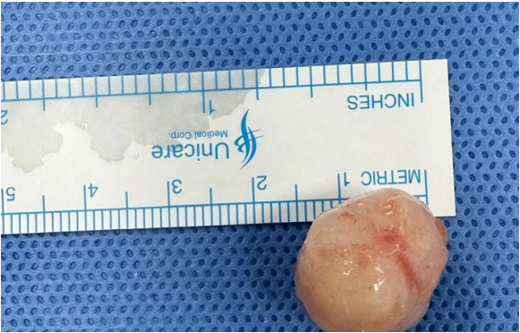 Given the lump's specific location, a giant cell tumor of the tendon sheath was firmly considered as the primary differential diagnosis. The patient was scheduled for an excisional biopsy fortnightly. During the procedure, an entire lesion was removed and forwarded for histopathological analysis. Two weeks after the excision, during the follow-up visit, the incision exhibited remarkable healing. There were no indications of infection, erythema, or discharge, and no traces of the nodule remained (Figure 4).