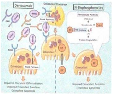 DEN acts similarly on osteoclast precursors, which is the natural receptor target of RANKL. DEN binds to RANKL, thereby preventing the binding of RANKL to its receptor, RANK, on osteoclasts and osteoclast precursors. Subsequently, the RANK signaling pathway is not activated, resulting in impaired differentiation of osteoclast precursors and their function, and potentially osteoclast apoptosis. All of these effects lead to the inhibition of bone resorption. Bisphosphonates (BPs) act on osteoclasts, but not on their precursors. BPs are internalized into osteoclasts, possibly through endocytosis. Subsequently, BPs inhibit farnesyl pyrophosphate (FPP) synthase, a key enzyme in the mevalonate signaling pathway. This leads to the degradation of intracellular proteins and the accumulation of cytotoxic intermediate products, including APPPL, thereby impairing osteoclast function and potentially inducing osteoclast apoptosis. Thus, bone resorption is inhibited. (1) Fig. 1