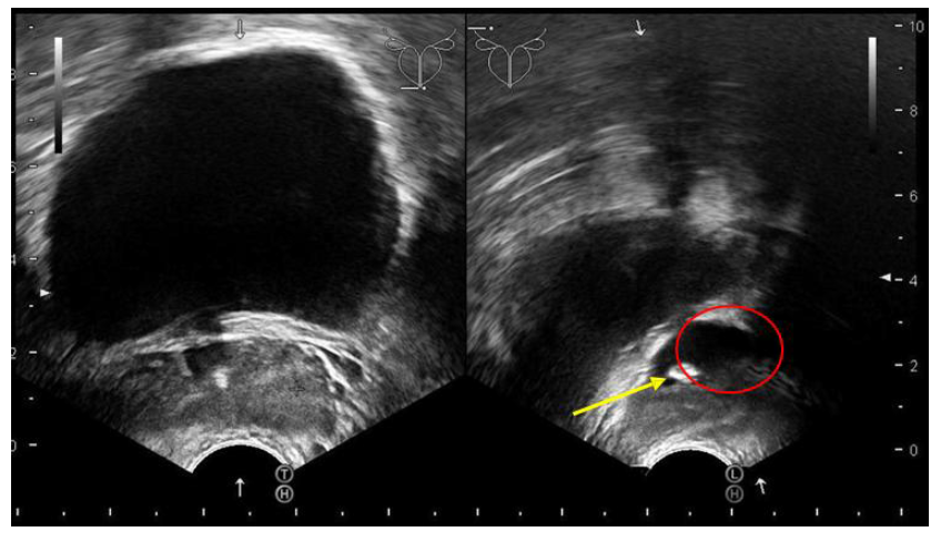 Figure 1: A transrectal sonography revealed that a 7 mm Stone (yellow arrow) with seminal vesicle (red circle) enlargement.