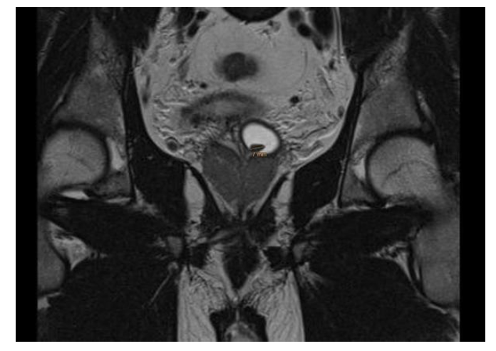 Next, we checked things out further with a pelvic MRI that confirmed a roughly 1.5 cm calculus lodged in the enlarged vesicle (Figure 2).