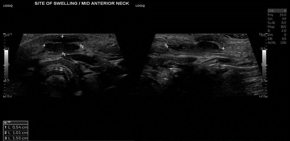 Revaluation of the case one week later in our clinic showed that inflammation subsided, no redness or hotness, no cervical lymph nodes were detected, an ultrasound neck was done and revealed a bilobed hypoechoic lesion located anterior to the hyoid bone, measuring 0.5 x 1 x 1.55 cm, consistent with a thyroglossal cyst, (figure 1).