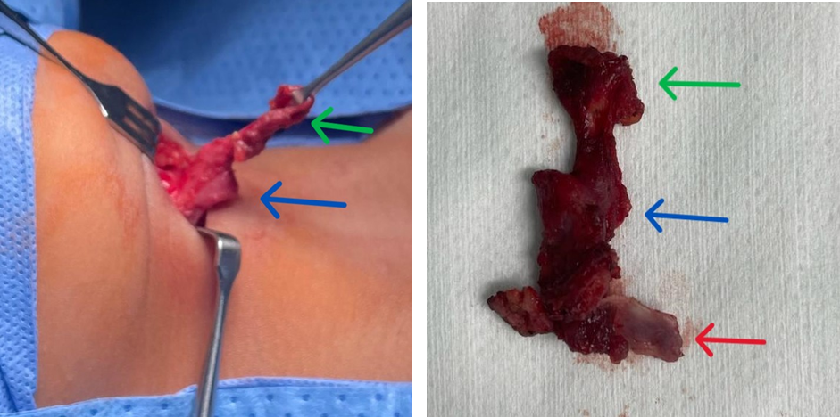 Figure 2 & 3: Green Arrow; Distal collapsed (ruptured) TGDC, Blue Arrow; Proximal second TGDC, Red Arrow; Central part of Hyoid bone.
