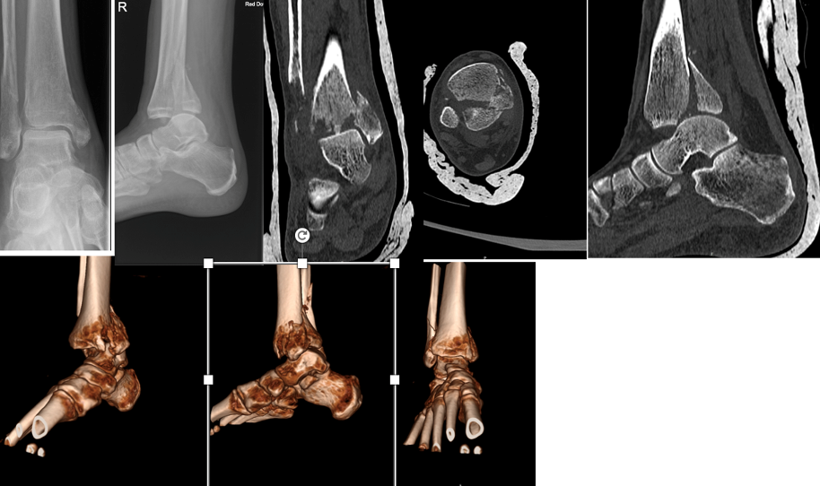 Fig 1 Radiographs and CT scan demonstrating different patterns of trimalleolar fractures.