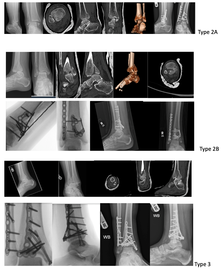 The Patient position and surgical approach to address these fractures was guided by fracture configuration and surgeon’s preference. Wherever possible we addressed the posterior malleolus fracture first and used the relative fragment specific implant. It allows the better radiographic visualisation of reduction and no interference from metalwork. This is followed by lateral malleolus fixation when fixing 2a fractures but in type 2b fractures, medial malleolus fracture was fixed before the lateral fragment stabilisation and in Type 3 sequence of fixation was dependent on type surgical approach. (Fig 4)