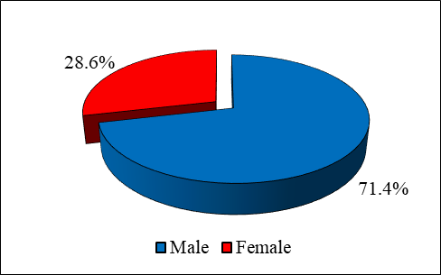 Majority of the patients were males (71.4%).The results of a study undertaken by Kunwar and collaborators (2020) also confirmed that most of the patients (58.2%) were males and 41.8% were female patients.[13] This is mostly thought to be due to the more active and aggressive nature of male subjects.