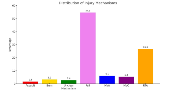 Among these trauma patients, majority experienced fall (54.6%), followed by, RTA (26.6%), MVA (6.1%), MVC (5.3%), burn (3.2%) and assault (1.6%). The results of a study performed by Dagnaw and teammates (2022) highlighted that most prevalent causes of trauma were falls (37.3%) and road traffic accidents (24.2%).[14]