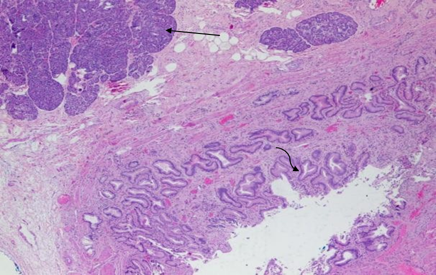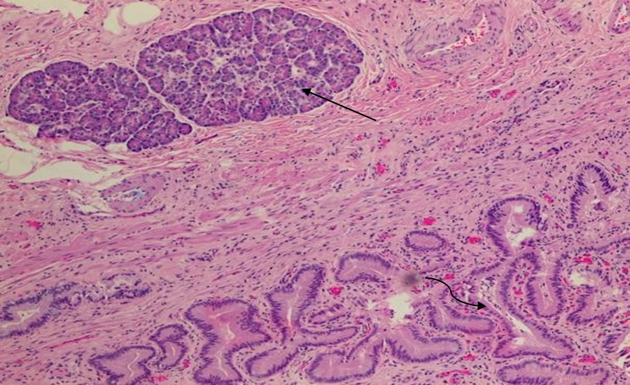 Figure 3 Histopathology of pancreatic heterotopia in the gallbladder of a 51-year-old woman using a hematoxylin and eosin stain demonstrates mucin secreting columnar epithelium lining the cystic duct (curved arrow) and pancreatic tissue (straight arrow). [100x view]