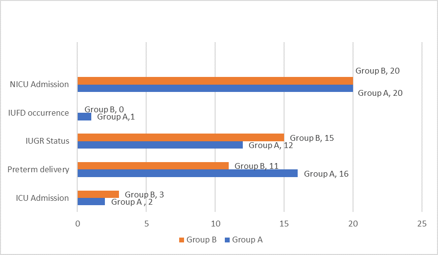 Figure 1 shows comparison of feto-maternal outcome between Group A & Group B. ICU admission following delivery was seen in 2 patients in group A as compared to 3 patients in group B. However, there was no association found between ICU admission and type of drug administered (p = 1.00). Regarding the gestational age at delivery (Figure 1), term delivery was seen in 34 and 39 patients in group A and B respectively. Preterm delivery was seen in 16 and 11 patients in group A and B respectively. However, the association between mode of delivery, time of delivery status and type of drug administered was not statistically significant (p = 0.26).