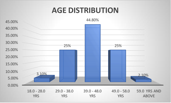 Ninety-six patients were included in this study, out of them 51% (n=49) were male and 49% (N= 47) are female. All patient had been distributed in five categories on the basis of age (Table 1). Among 96 patients 3.1% (n=3) belonged to age group of 18-28 years, while in the second group which belong to age group of 29–38-year 25% (n= 24) case were there, age group of 39-48 had 44.8 % (n=43) cases, in fourth group there was 25% (n=24) which belong to age group of 49-59 years, remaining all case included in 5th group.