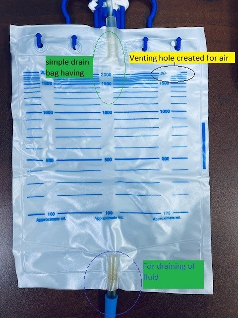 Results: All patients showed clinical improvement on follow-up. No major complications, readmissions, or infections were reported in either group. Patients discharged with the drain bag reported better compliance and ease of use. The bag, equipped with a bottom valve for fluid drainage and a top vent hole for air release, proved to be a cost-effective alternative to the Heimlich valve.