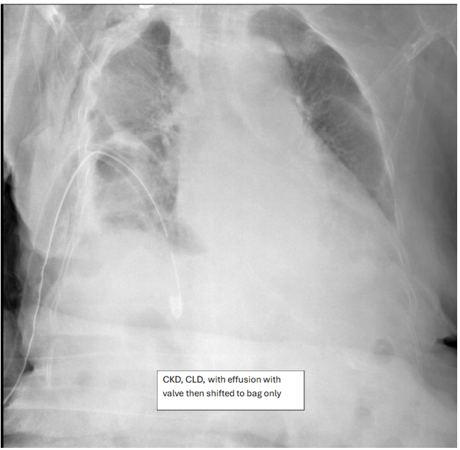 Both interventions were connected to the standard thoracic chest tube (28–32 Fr) and secured appropriately. Instructions on home care, fluid disposal, and signs of complications were given to all patients and caretakers. Follow-up occurred at 7 days or earlier if complications arose.