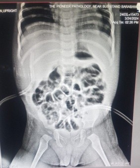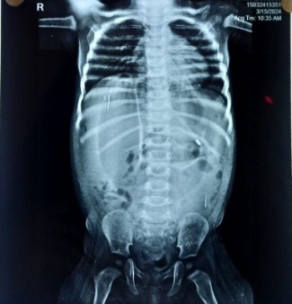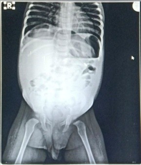 A previously healthy 1-year-old male baby was admitted with clinical signs of severe dehydration after 3 days of diarrhea, vomiting and fever. Upon admission he was lethargic and had clinical signs of shock with cold extremities, a prolonged capillary refill time (>3s) and tachycardia and abdominal distention. He was managed conservatively and advised X ray abdomen supine [Figure 1] which showed post diarrhoeal paralytic ileus with dilated bowel loops. Ultrasonography showed only mild fluid collection with internal septations. A plain abdominal x ray (erect) revealed free sub-diaphragmatic air [figure 2]. Suspecting intestinal perforation we decided to perform an exploratory laparotomy which revealed a small post-pyloric duodenal perforation [Figure 4]. Grahams patch repair was performed [Figure 5]. The postoperative course was uneventful [Figure 3]. Rotavirus antigen was found in feces.