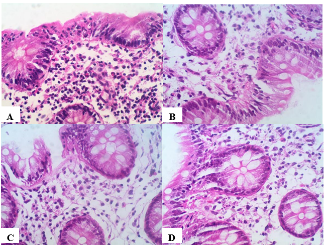 Eosinophilic Involvement and Crypt Changes: A notable finding in this study is the significant presence of eosinophils in the crypts, observed in 53.64% of patients. Eosinophils are often associated with allergic reactions, parasitic infections, and certain forms of chronic inflammation. Their predominance in the crypts in TBC may suggest an ongoing immune reaction localized to the mucosal layer of the colon, distinct from the acute inflammatory changes seen in other forms of colitis.5