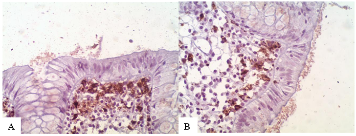Eosinophils are found predominantly in the crypts of the colon (eosinophilic cryptitis in 53.64%; Figure 2A, B), while eosinophils in the surface epithelium were rare (6.36%). Layering of the surface epithelial layers is seen in all cases (Figures 2: C-D). other histopathological features: Neutrophils: Present in both the lamina propria and surface epithelium, but in only 6% of cases, indicating minimal acute inflammation. Crypt Abscesses: Rare, seen in 4.55% of cases. Acute Cryptitis: Observed in 15% of cases. Mast Cells: Absent in all patients. Plasma cells in the lower lamina propria were present in 39.09% of cases, reflecting chronic inflammation. Eosinophilic Cryptitis: Noted in 53.64% of cases. Increased chronic Inflammation in the lamina propria: Present in 79.09% of patients. Glandular Branching: Focally present in 52% of cases, suggesting some degree of mucosal remodeling. Glandular Drop: Present in 76% of cases, reflecting structural changes in the colonic glands. CD68 (an immunostainings for tangible body macrophages) is increased in marked degree compared to normal colonic cases. (Figure 3 A B)