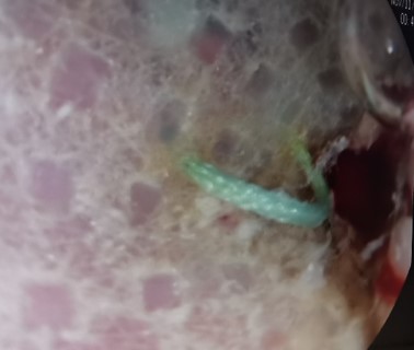 With extreme caution and under strict endoscopic control, traction is applied (Figure 4) to the material, achieving en bloc extraction (Figure 5). A CT scan was performed, ruling out complications (Figure 6). The patient was discharged after 4 days asymptomatic, with normal outpatient endoscopic follow-up.
