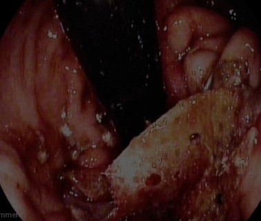 Figure 1. Whitish, firm material with exposed suture thread following food bolus disimpaction, compatible with surgical mesh.