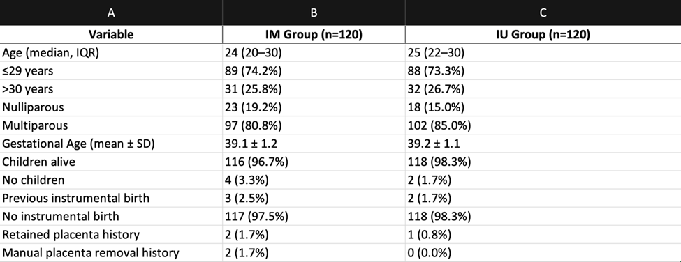 A total of 240 eligible pregnant women participated in this trial between April and September 2023. They were randomized into two groups: intraumbilical (IU) group (n=120) and intramuscular (IM) group (n=120). The groups were comparable in baseline characteristics including age, parity, gestational age, and obstetric history.