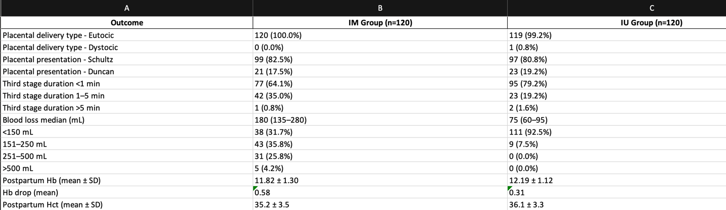 The IU group experienced a significantly lower median blood loss (80 mL; IQR 60–100 mL) compared with the IM group (200 mL; IQR 144–300 mL; P<0.001). In the IU cohort, 92.1% lost <150 mL versus 33.1% in the IM cohort, and no IU patients lost >500 mL. The third-stage duration was shorter in the IU group (median 0.4 min; IQR 0.25–1.0 min) than in the IM group (0.5 min; IQR 0.4–1.15 min; P<0.001). Postpartum hemoglobin and hematocrit declines were less pronounced in the IU arm.