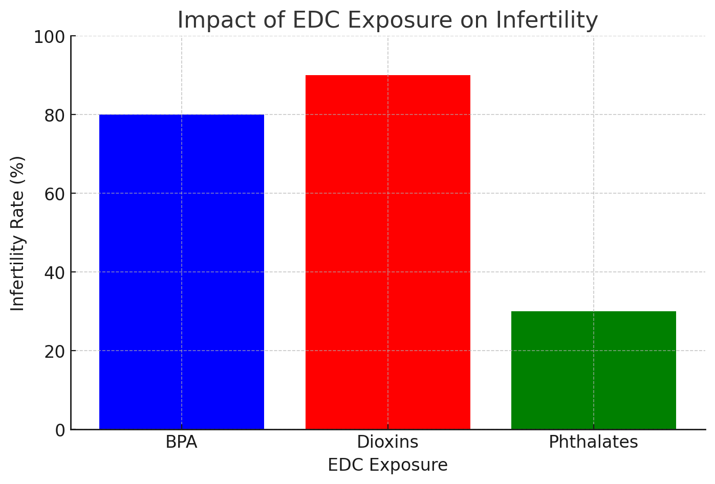 Graph 1: Impact of EDC Exposure on Infertility (Bar graph showing infertility rates among women exposed to BPA, dioxins, and phthalates.)