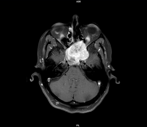 Final histopathological analysis of the excised tissue confirmed the diagnosis of schwannoma. Subsequent detailed review of the preoperative MRI suggested that the mass originated from the Vidian nerve.