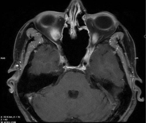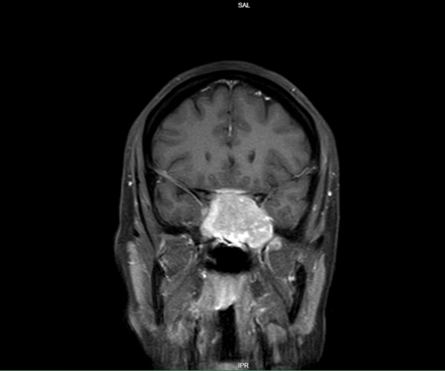 We report the case of a 45-year-old woman who presented with complaints of vision changes and dryness in her eye. Magnetic resonance imaging (MRI) revealed a large, homogeneously contrast-enhancing mass located in the sphenoid sinus, accompanied by evidence of bone remodeling at the skull base (Figure 1,2).