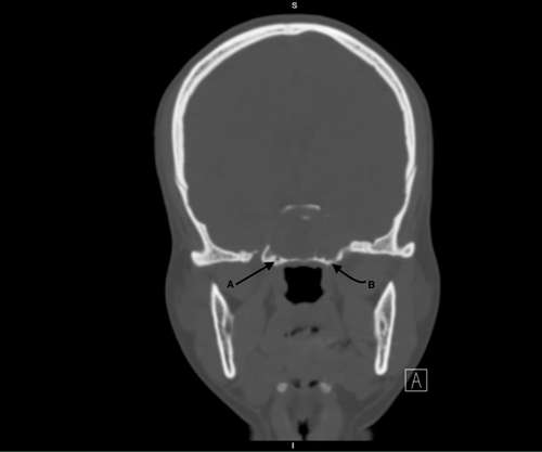 Figure 3: CT coronal view bone window showing bilateral vidian canals