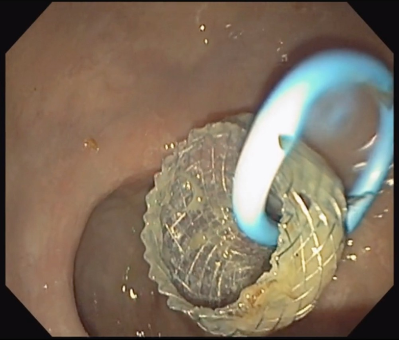 Figure 1: Endoscopic view showing successful deployment of a LAMS (Axios) into a rectal abscess cavity, with a coaxially placed 7 Fr × 3 cm double pigtail plastic stent to support ongoing drainage and minimize occlusion