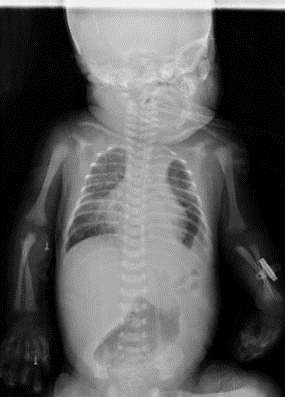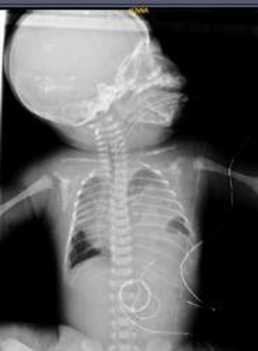 Male newborn, 36.4 weeks by last menstrual period, Apgar 5 -7T, weight 2,570 grams, ORH+. No significant maternal history, normal prenatal ultrasounds. Born in a second- level hospital, presenting with acute respiratory distress, requiring advanced neonatal resuscitation with positive pressure ventilation and orotracheal intubation. Transferred to our hospital where the presence of left diaphragmatic hernia associated with respiratory insufficiency, shock, perinatal asphyxia, and seizures was determined. Admitted to the neonatal intensive care unit in the following conditions: Hypotonic, flaccid, hyporeactive pupils with diminished brainstem reflexes, oro-intubated, shock score 4 points, and on vasoactive drugs. Chest X-ray showed the presence of intestinal loops in the left hemithorax, signs of left pulmonary hypoplasia (figure 1);