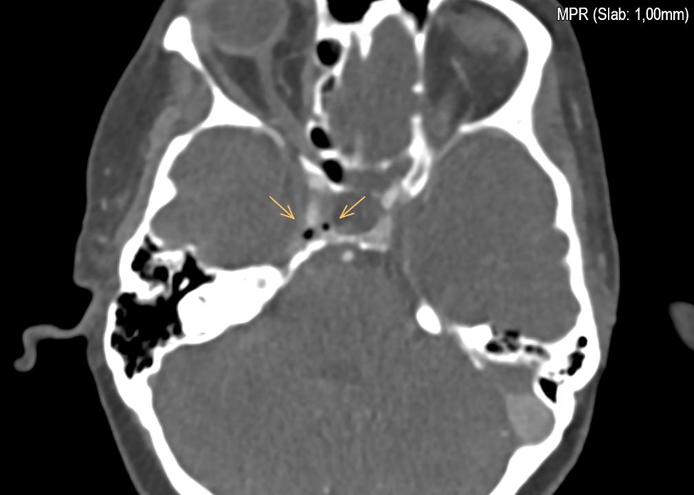 Primarily, they include a patent foramen ovale, the presence of right or left intrapulmonary shunts, and the forcing of air through the pulmonary filter. According to the literature on venous embolism, our case suggests that air likely migrated from the arm, passing through the right subclavian vein and entering the internal jugular vein on a cranial path. Once in the internal jugular vein, the air travels through the inferior petrosal sinus, ultimately reaching the cavernous sinus. Patients experiencing gas embolism may not exhibit symptoms; however, they can present with headache, nausea, vomiting, dizziness, or seizures. As the literature indicates, the etiology of these symptoms remains poorly understood.