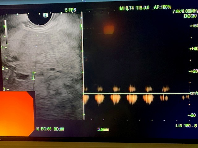Figure 5: Doppler of middle hepatic vein to ensure hemostasis post-manometry.