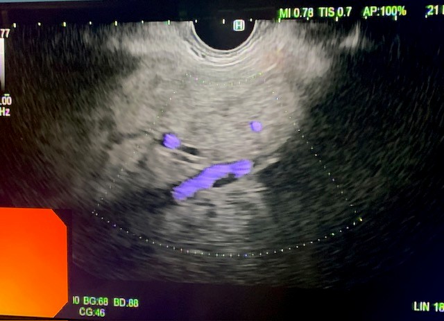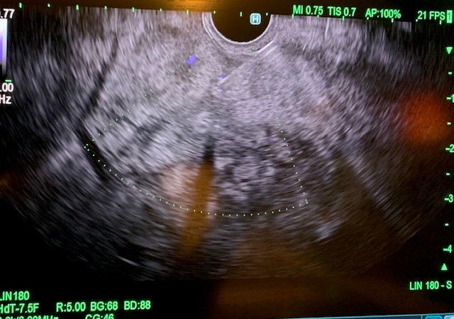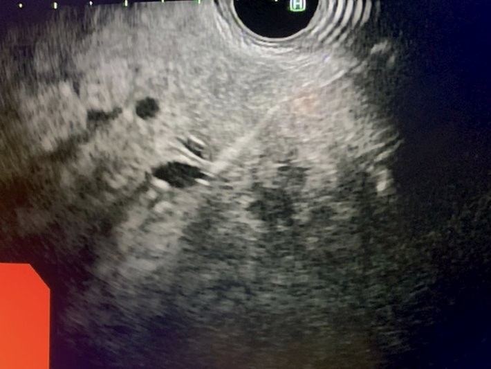 Patient is a 50-year-old female with a past medical history of class 2 obesity, metabolic dysfunction-associated steatotic liver disease (MASLD) and primary biliary cholangitis (PBC) managed with seladelpar and ursodeoxycholic acid. Earlier this year, she underwent elastography (Fibroscan), which revealed a fibrosis score of 2 and steatosis score of 2. Despite adherence to exercise and dietary modifications, her body mass index remained elevated. Additionally, she had persistently elevated alkaline phosphatases of 135U/L despite pharmacologic therapy and lifestyle changes. Given her history of PBC and MASLD, the decision was made to proceed with endoscopic ultrasound-guided portal pressure gradient (EUS-PPG) and liver biopsy. These procedures aimed to assess the degree of portal hypertension and to further evaluate liver histology for fibrosis and any other underlying liver pathology, including autoimmune hepatitis.