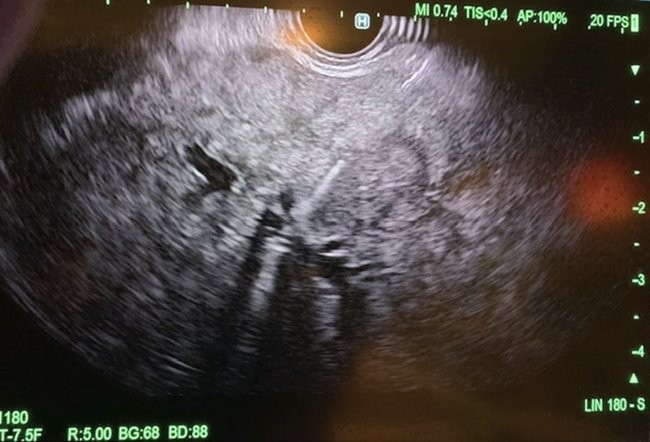 Figure 2: Middle hepatic vein needle with manometry to obtain hepatic vein pressure accessed via transgastric, transhepatic approach.