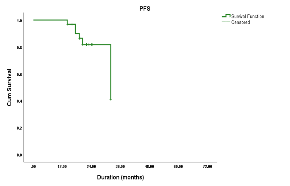 Regarding PFS in figure (1) , our patients showed median PFS of 32 months (95% CI: 15.7 - 48.3) consistent with a study by Jomaa and Nagy reported a 15 months in TNBC patients ( 19). In our cohort, the PFS rate remained at 100% up to 12 months then a gradual decline was observed at 18 months and 24 months by(86.5%) and (81.7%) respectively , denoting an increasing risk of progression over time reaches to the only half of the patients at 36 months (40.8%), This pattern aligns with findings from a study on TNBC patients, which reported a 3-year progression -free survival rate of 63.2% (20)