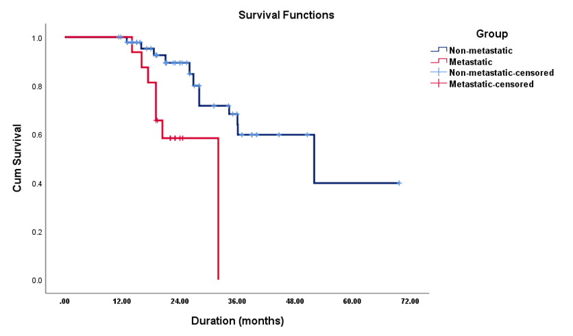 Non-metastatic cohort have a significantly longer Overall median survival time 52 months compared to metastatic patients 36 months . Factors associated with dismal OS include age ≥40 years (HR=2.15, p=0.004), locally advanced stage (HR=1.85, p=0.016) and LVI (HR=1.89, p=0.012), positive nodal status (HR=2.24, p=0.002), metastatic disease at presentation (HR=3.42, p<0.001), multiple metastatic sites (HR=2.18, p=0.004), and brain metastasis (HR=2.85, p<0.001) carries shorter OS, which remained independent statistical significance in multivariate analysis.