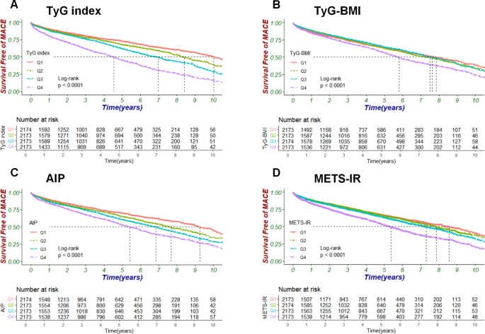 They observed overall 8693 patients met the inclusion criteria in addition to, got included in the ultimate assessment. The average age of the patients was 70.59 ± 10.6 years, with 5045 (58.04%) being male. The Kaplan-Meier survival evaluation displayed that greater of the four IR indices was correlated with greater risk of MACE (all log-rank P < 0.05). Once considered lesser in the form of a continuous variable, the TyG index illustrated a significant correlation amongst MACE (HR 2.1, 95% CI 1.98–2.23, P < 0.001 in model 1; HR 1.81, 95% CI 1.73–1.9, P < 0.001 in model 2; HR 1.68, 95% CI 1.6–1.76, P < 0.001 in model 3). Once divided into quartiles, the highest quartile of the TyG index (Q4) was significantly correlated with MACE (HR 2.48, 95% CI 2.24–2.76, P < 0.001 in model 3). Kindred significant correlation were observed amongst TyG-BMI, AIP, METS-IR, as well as MACE. The TyG index was observed to escalate the risk stratification capacity of the MAGGIC score (AUC from 0.601 to 0.666). Once contrasted with other IR pointers, the TyG index illustrated superior differentiation in addition to reclassification capabilities in anticipating MACE. Furthermore, the TyG-BMI index displayed a U-shaped association amongst MACE, pointing that both an escalated along with a lesser TyG-BMI index readings were correlated with an escalated risk(see Figure1-3).