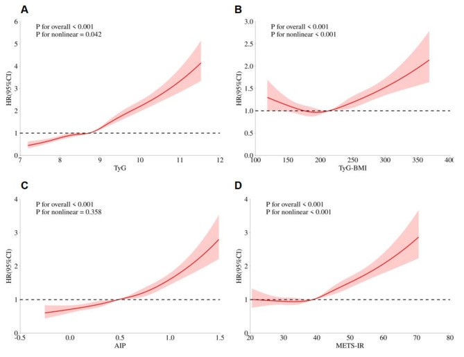 Figure2: RCS for the associations between the IR indexes and MACE. Red shadows and lines represent the 95% CI. TyG index (A), TyG-BMI (B), AIP (C), METS-IR (D). HR (95%CI) was adjusted according to the model 3. RCS, restricted cubic spline; IR, insulin resistance; MACE, major adverse cardiovascular event; HR, hazard ratio; CI, confidence interval; TyG, triglyceride-glucose; TyG-BMI, triglyceride-glucose index with body mass index; AIP, atherogenic index of plasma; METS-IR, metabolic score for insulin resistance