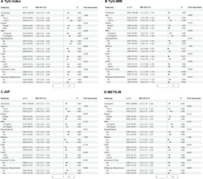 Figure3: Subgroup analysis of the IR indexes (per 1 SD) for MACE. TyG index (A), TyG-BMI (B), AIP (C), METS-IR (D). IR, insulin resistance; SD, standard deviation; MACE, major adverse cardiovascular event; TyG, triglyceride-glucose; TyG-BMI, triglyceride-glucose index with body mass index; AIP, atherogenic index of plasma; METS-IR, metabolic score for insulin resistance; HR, hazard ratio; CI, confidence interval; BMI, body mass index; CKD, chronic kidney disease; LVEF, left ventricular ejection fraction; LA, left atrial