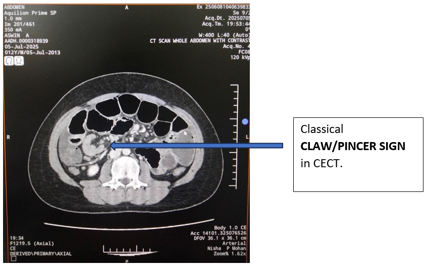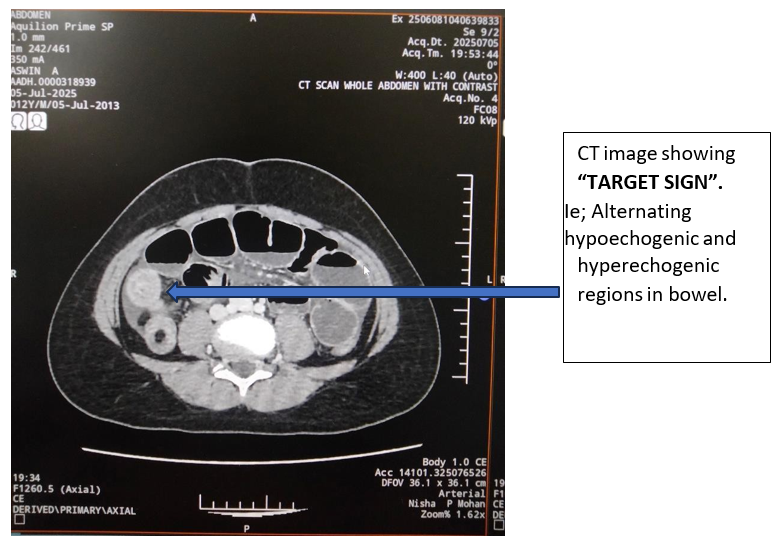 A 12-year-old male child was admitted to emergency department with complaints of abdominal pain and recurrent episodes of vomiting since 2 days. On examination, the child was conscious, oriented, afebrile and vitals were stable. On per abdominal examination, there was distention and tenderness was present over Right hypochondrium, epigastrium and umbilical regions. There was no guarding and rigidity with active bowel sounds. Initially child was kept nil per oral and kept under continuous Ryles tube aspiration. Simultaneously child was managed with IV fluids and broad-spectrum antibiotics. All routine blood investigations were done and was within normal limits. Ultrasound abdomen showed: long segment ileocecal and ileoileal intussusception at right lower quadrant region with evidence of alternating hypoechogenic and hyperechogenic regions giving classical “target sign”. Mild dilatation of proximal small bowel loops (3.2cm maxi). Since intussusception is unusual at this age, to find the lead point CECT abdomen was taken;
