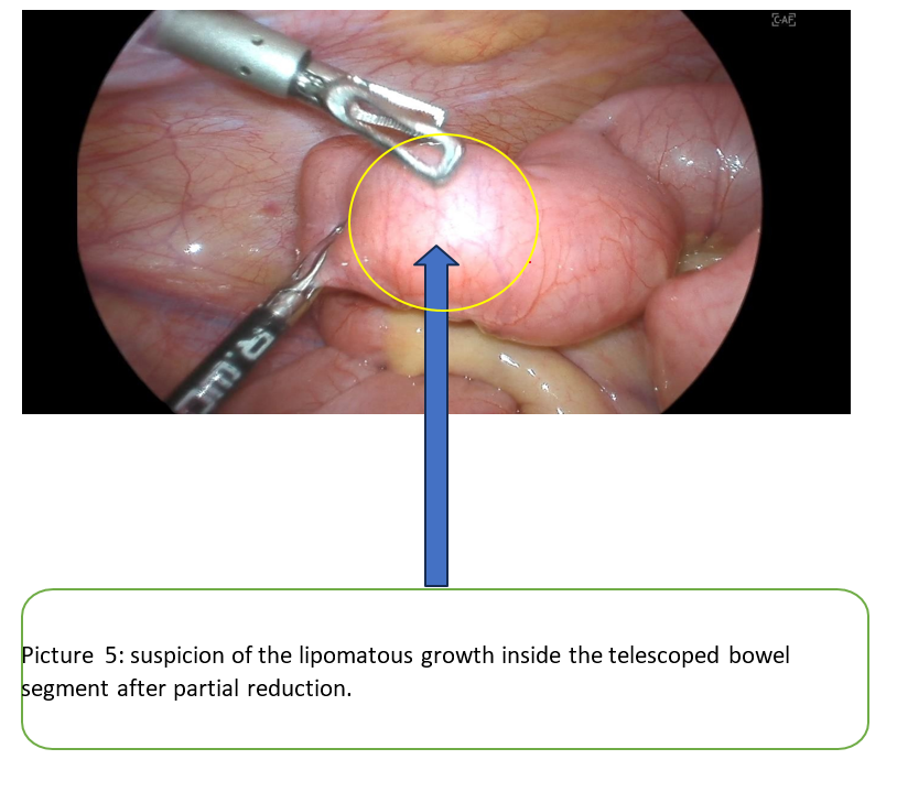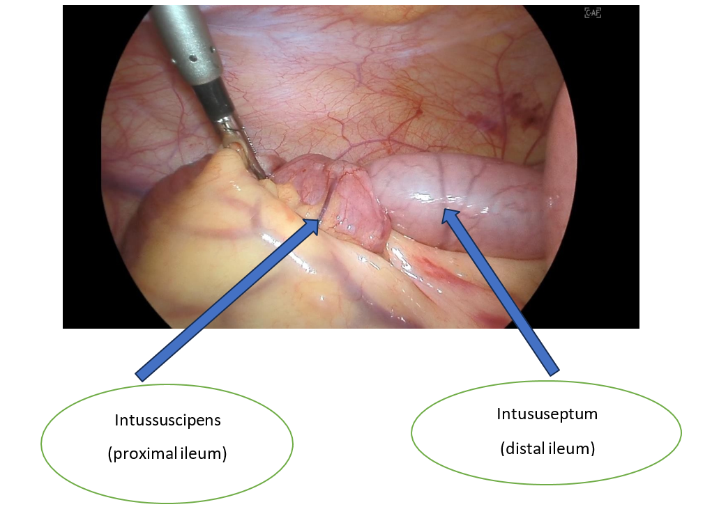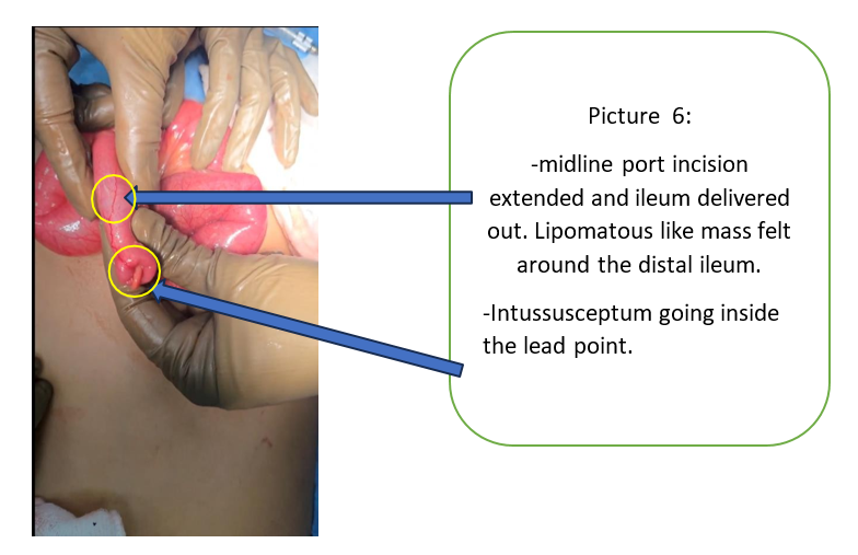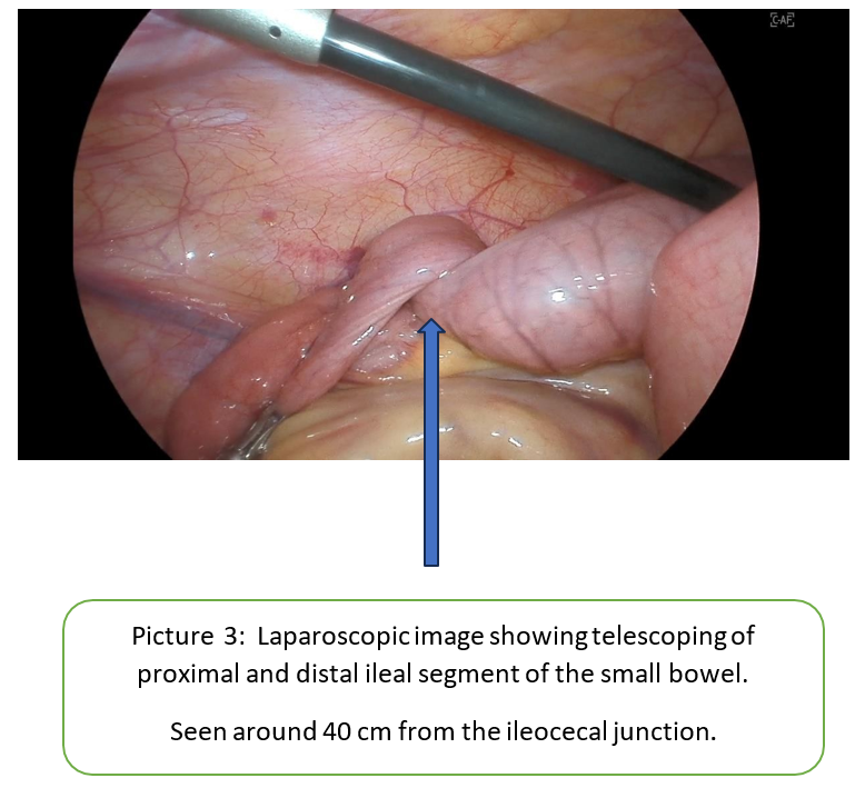 Since the patient presented as an emergency with features of Intestinal Obstruction, an emergency Diagnostic laparoscopy was planned. Under General Anaesthesia, 10mm Umbilical (camera) and two 5mm iliac fossa (right and left) working ports were placed. On bowel walking, distal ileal (40cms from IC junction), ileoileal intussuception was identified and was subsequently reduced (pictures 3, 4, 5). Subsequently, a small 5 cms midline incision was made for thorough inspection of the small bowel and to identify the pathology.