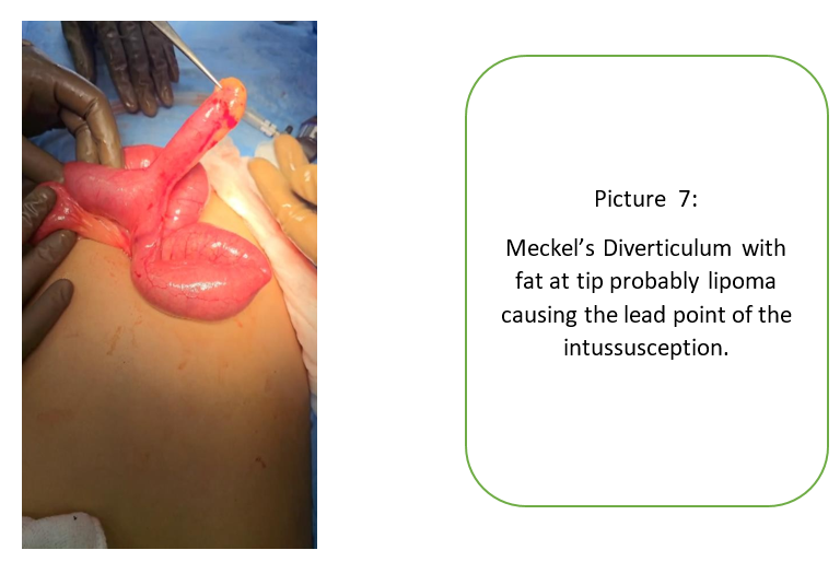 On manually inspecting the bowel, an ileoileal intussuception was identified at 60 cms from IC junction and on further reducing it manually, it was found to be an inverted Meckel’s diverticulum with fatty tissue at the tip of the diverticulum causing a lead point for the same.