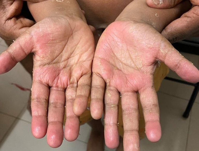 Figure 1 :- Palmar erythema and peeling : Classic hand manifestation in Kawasaki disease