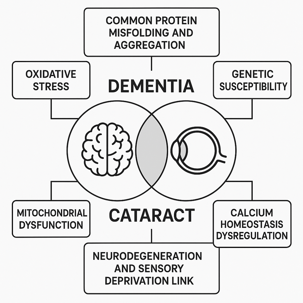 Cataracts and dementia share several underlying biological mechanisms, particularly chronic oxidative stress and inflammation. Cataract formation results from protein aggregation and lens opacification due to oxidative damage, while similar mechanisms contribute to neuronal loss in Alzheimer's disease.36
