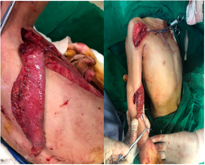 Figure 1- Intraoperative photographs of bipolar Latissimus dorsi transfer. a) Demonstrating tubed muscle, b) showing tubed flap transferred to the proximal and distal fixation sites.
