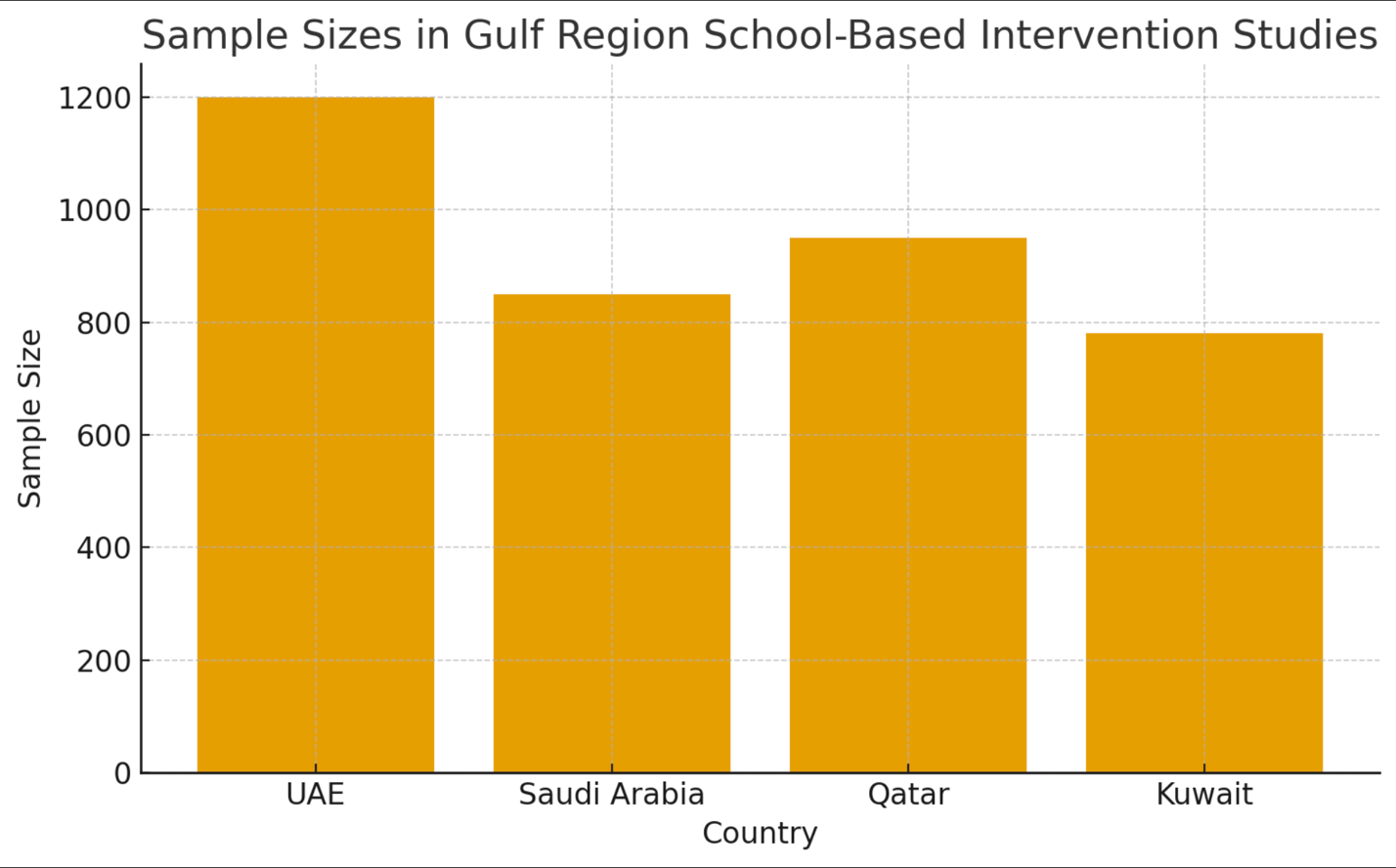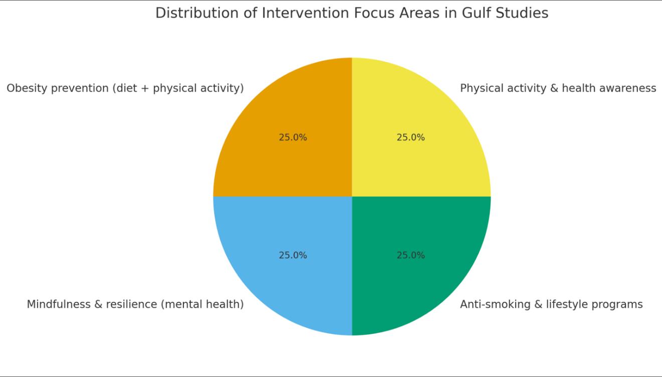 In addition to global findings, region-specific evidence from Gulf countries provides valuable insights into the effectiveness of school-based interventions. A large-scale obesity prevention initiative conducted in the United Arab Emirates between 2019 and 2022 targeted more than 1,200 schoolchildren aged 10 to 15 years. The program combined structured physical activity with nutritional education and demonstrated meaningful reductions in BMI, alongside significant improvements in physical activity levels. In Saudi Arabia, mindfulness and resilience-based interventions were introduced to 850 adolescents between 2020 and 2023. These interventions, although modest in effect, showed reductions in anxiety and stress scores, suggesting that mental health initiatives can be successfully implemented in culturally sensitive school environments. Similar patterns were observed in Qatar, where anti-smoking and health promotion programs were implemented between 2018 and 2021 among 950 high school students. These interventions reduced smoking initiation rates and improved awareness of risky lifestyle behaviors. In Kuwait, physical activity and health-awareness campaigns conducted from 2019 to 2021 engaged 780 students, leading to increased participation in physical exercise, though the effect on BMI was less pronounced compared with the UAE program.