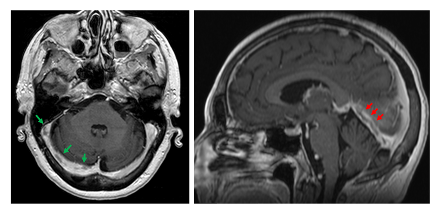 Fig. 1 MRI T1-weighted images with contrast. Filling defects in the transverse and sigmoid venous sinuses (green arrows, axial view). Lineal filling defect in the straight venous sinus (red arrows, sagittal view).